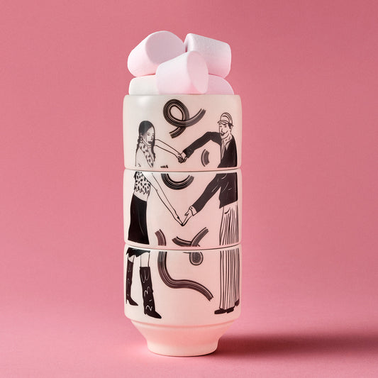 The ceramic mugs and cups in the collection are adorned with HugLoveKiss's characteristic "table drawing" design. These patterns, applied individually using decal transfer techniques, make each piece unique. Ideal for coffee, tea, and hot beverages, these mugs, with their minimalist lines, soft contours, and special box presentation, make an ideal gift option.
