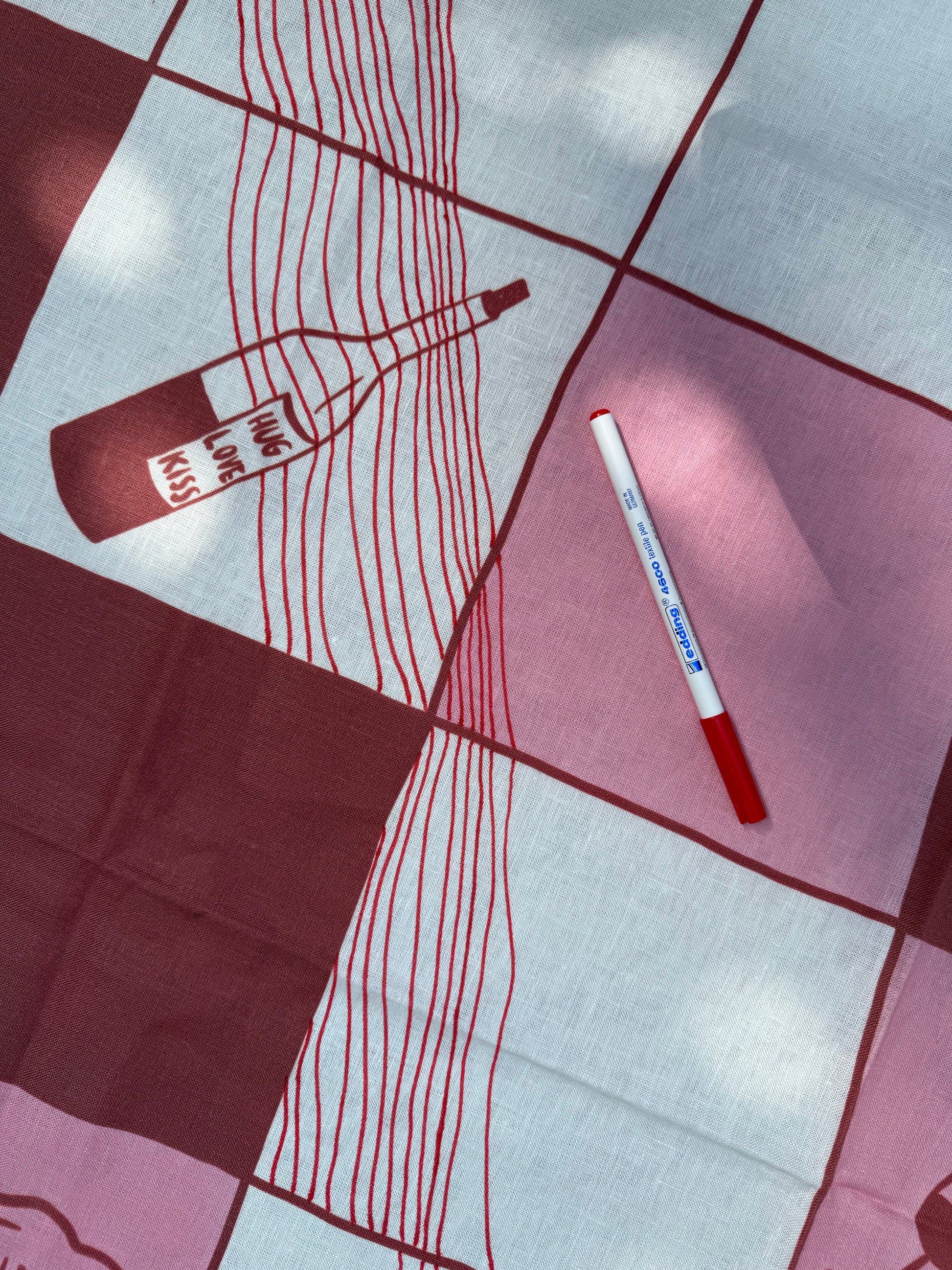 Within the squares of this tablecloth, there are four that we've personally completed with hand-drawn lines. Each one isn't random, but rather a conscious touch! Because Hug Love Kiss believes that everything should be made with handcraftsmanship and love.